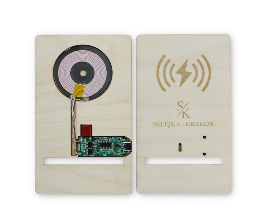 Moduł bezprzewodowej ładowarki indukcyjnej przeznaczony do bezprzewodowego przekazywania energii elektrycznej do urządzeń wyposażonych w odbiornik zgodny ze standardem. Zestaw składa się z płytki drukowanej z układem elektronicznym sterującym pracą ładowarki oraz cewki nadawczej odpowiedzialnej za wytwarzanie pola elektromagnetycznego umożliwiającego bezprzewodowe ładowanie.